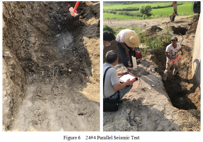 RSM-PST Parallel Seismic Tester is used for relevant tests. Before the test, the soil layer above the cushion cap shall be excavated to expose the surface of the cushion cap, and the trigger accelerometer shall be installed on the surface of the cushion cap and fixed with mud. The specification of the vibrating hammer is 12 pounds, and the displacement of the measuring point is 20cm.